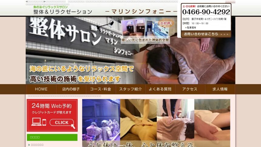 藤沢市で多くのリピーターを持つ『マリンシンフォニー』は、落ち着いた空間で心身ともにリラックスできる時間を提供しています。 完全個室のプライベート空間で周りを気にせず過ごせます、日本人スタッフによる丁寧な対応も好評です、駐車場完備で車での来店もしやすい点も魅力です、キャッシュレス決済に対応しているため会計もスムーズです。経験豊富なスタッフが一人ひとりに合わせた施術を行ってくれます。 営業時間は10:00-19:00。 年中無休で営業しています。 ご予約やお問い合わせはお電話(0466-90-4292)にて受け付けています。 癒しを求める多くの方におすすめのサロンです。