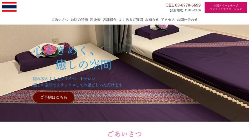 初めての方でも利用しやすい『バンタイリラクゼーション』は、やさしい照明と香りに包まれながら、疲れた身体をゆっくり癒せる環境が整っています。 施術後に利用できるシャワー設備も整っています、タイ人セラピストによる本場の技術を味わえます。タイ古式特有のゆったりと流れるリズムで心身ともに癒されます。 営業時間は11:00-23:00。 定休日は不定休です。 お電話(03-6770-6699)からも予約が可能です。 日々の疲れを癒したい方にぴったりのお店です。