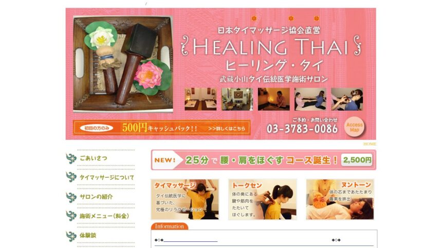 初めての方でも利用しやすい『ヒーリングタイ』は、やさしい照明と香りに包まれながら、疲れた身体をゆっくり癒せる環境が整っています。 完全個室のプライベート空間で周りを気にせず過ごせます、日本人スタッフによる丁寧な対応も好評です。適度な力加減で身体のコリをしっかりほぐしてくれます。 営業時間は11:00-21:30(日曜12:00から)。 定休日は水曜です。 予約に関する問い合わせは(03-3783-0086)までお気軽にどうぞ。 日々の疲れを癒したい方にぴったりのお店です。