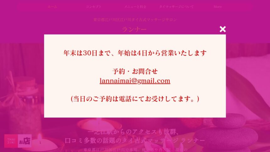 番目に大きい都市エリアで人気の『Lan Na(ランナー)』は、静かでリラックスできる雰囲気が魅力で、忙しい日々のリフレッシュに最適です。 完全個室のプライベート空間で周りを気にせず過ごせます、施術後に利用できるシャワー設備も整っています、タイ人セラピストによる本場の技術を味わえます、駐車場完備で車での来店もしやすい点も魅力です。適度な力加減で身体のコリをしっかりほぐしてくれます。 営業時間は12:00-21:00(月火定休)。 年中無休で営業しています。 お電話(03-5879-7171)からも予約が可能です。 心身ともにリラックスしたい方にぜひ訪れてほしいお店です。