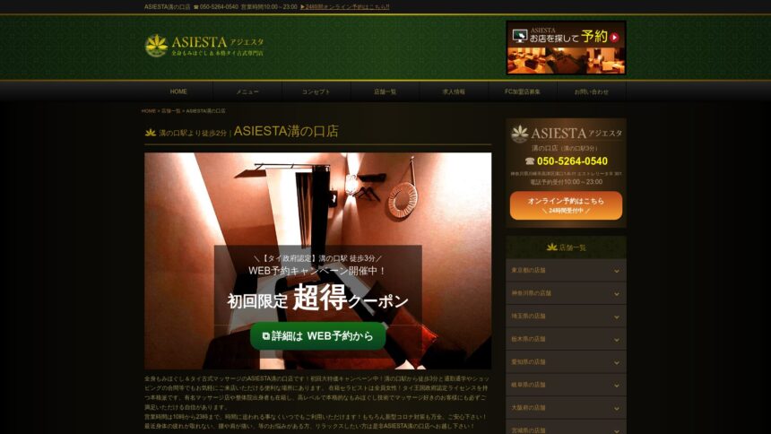 地元川崎市で評判の『アジエスタ溝の口店』は、落ち着いた空間で心身ともにリラックスできる時間を提供しています。 完全個室のプライベート空間で周りを気にせず過ごせます、日本人スタッフによる丁寧な対応も好評です、キャッシュレス決済に対応しているため会計もスムーズです。タイ古式特有のゆったりと流れるリズムで心身ともに癒されます。 営業時間は10:00-23:00。 年中無休で営業しています。 お電話(050-5264-0540)からも予約が可能です。 日々の疲れを癒したい方にぴったりのお店です。