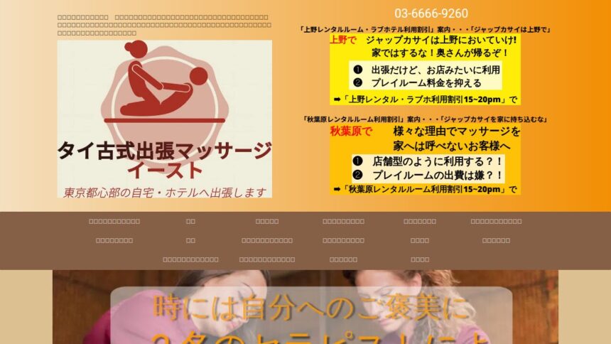 落ち着いた雰囲気が魅力の『イースト』は、やさしい照明と香りに包まれながら、疲れた身体をゆっくり癒せる環境が整っています。 日本人スタッフによる丁寧な対応も好評です、キャッシュレス決済に対応しているため会計もスムーズです、出張マッサージにも対応しており、自宅でも施術が受けられます。タイ古式特有のゆったりと流れるリズムで心身ともに癒されます。 営業時間は15:00-24:00。 年中無休で営業しています。 お電話(03-6666-9260)からも予約が可能です。 忙しい毎日のリフレッシュに最適なサロンです。