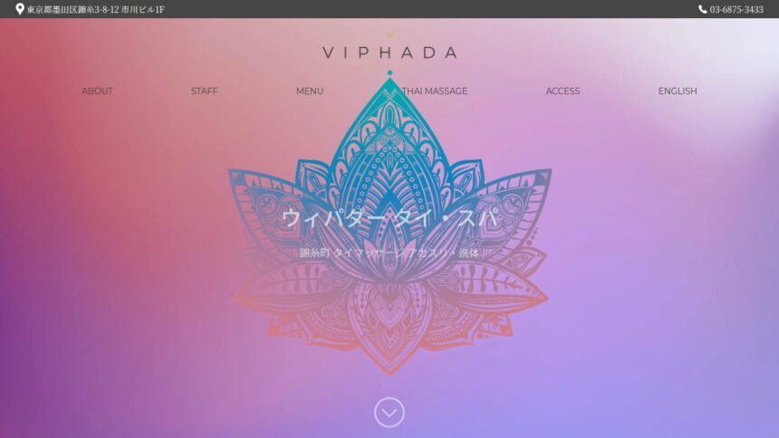 落ち着いた雰囲気が魅力の『ウィパダー タイ・スパ』は、静かでリラックスできる雰囲気が魅力で、忙しい日々のリフレッシュに最適です。 完全個室のプライベート空間で周りを気にせず過ごせます、施術後に利用できるシャワー設備も整っています、タイ人セラピストによる本場の技術を味わえます。丁寧で心地よい施術が魅力で、施術後は身体が軽くなると評判です。 営業時間は12:00-翌1:00。 年中無休で営業しています。 予約に関する問い合わせは(03-6875-3433)までお気軽にどうぞ。 癒しを求める多くの方におすすめのサロンです。