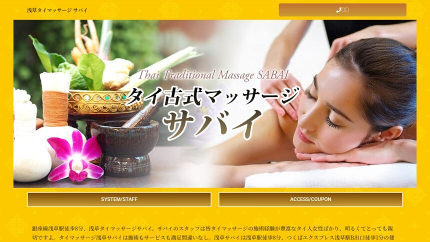 落ち着いた雰囲気が魅力の『サバイ』は、清潔感あふれる店内で、初めての方でも安心して施術を受けられます。 完全個室のプライベート空間で周りを気にせず過ごせます、施術後に利用できるシャワー設備も整っています、タイ人セラピストによる本場の技術を味わえます。適度な力加減で身体のコリをしっかりほぐしてくれます。 営業時間は11:30-23:00。 定休日は無休アクセス:銀座線です。 お電話(090-8366-2456)からも予約が可能です。 日々の疲れを癒したい方にぴったりのお店です。