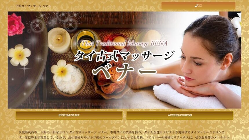 筑西市エリアで人気の『BENA(ベナー)』は、清潔感あふれる店内で、初めての方でも安心して施術を受けられます。 タイ人セラピストによる本場の技術を味わえます、駐車場完備で車での来店もしやすい点も魅力です。適度な力加減で身体のコリをしっかりほぐしてくれます。 営業時間は11:00-24:00。 年中無休で営業しています。 ご予約やお問い合わせはお電話(080-8564-4799)にて受け付けています。 癒しを求める多くの方におすすめのサロンです。