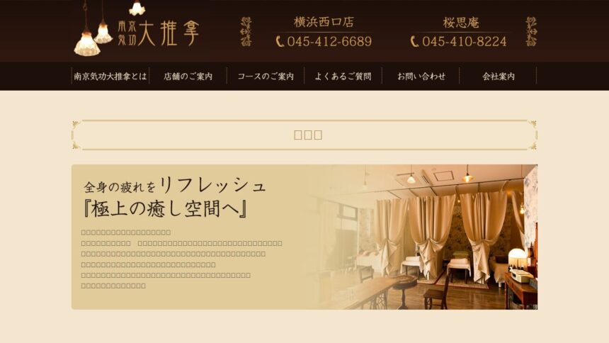 横浜市で多くのリピーターを持つ『大推拿(ダイスイナ)桜思庵』は、清潔感あふれる店内で、初めての方でも安心して施術を受けられます。 日本人スタッフによる丁寧な対応も好評です、駐車場完備で車での来店もしやすい点も魅力です。タイ古式特有のゆったりと流れるリズムで心身ともに癒されます。 営業時間は11:00-22:00。 年中無休で営業しています。 日々の疲れを癒したい方にぴったりのお店です。
