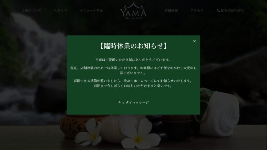 坂東市にある本格サロン『YAMA(ヤマ)』は、清潔感あふれる店内で、初めての方でも安心して施術を受けられます。 タイ人セラピストによる本場の技術を味わえます、駐車場完備で車での来店もしやすい点も魅力です。適度な力加減で身体のコリをしっかりほぐしてくれます。 営業時間は11:00-翌1:00。 年中無休で営業しています。 お電話(070-3365-0730)からも予約が可能です。 癒しを求める多くの方におすすめのサロンです。
