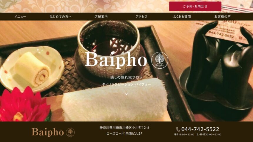 地元川崎市で評判の『Baipho(バイフォー)』は、アジアンテイストの空間が広がり、まるで旅行に来たようなリラックス感が味わえます。 施術後に利用できるシャワー設備も整っています、日本人スタッフによる丁寧な対応も好評です、タイ人セラピストによる本場の技術を味わえます、キャッシュレス決済に対応しているため会計もスムーズです。経験豊富なスタッフが一人ひとりに合わせた施術を行ってくれます。 営業時間は13:00-22:00(土日祝12:00から)。 年中無休で営業しています。 ご予約やお問い合わせはお電話(044-742-5522)にて受け付けています。 忙しい毎日のリフレッシュに最適なサロンです。