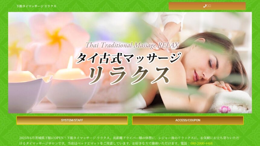 筑西市にある本格サロン『リラクス』は、静かでリラックスできる雰囲気が魅力で、忙しい日々のリフレッシュに最適です。 タイ人セラピストによる本場の技術を味わえます、駐車場完備で車での来店もしやすい点も魅力です。経験豊富なスタッフが一人ひとりに合わせた施術を行ってくれます。 営業時間は11:00-24:00。 定休日は無休アクセス:下館です。 ご予約やお問い合わせはお電話(080-2000-4468)にて受け付けています。 心身ともにリラックスしたい方にぜひ訪れてほしいお店です。